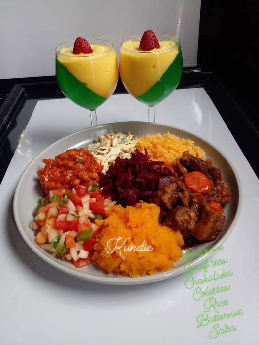 Beefcurry, potato salad, spinach, chakalaka, butternut, betroot and garden salad.